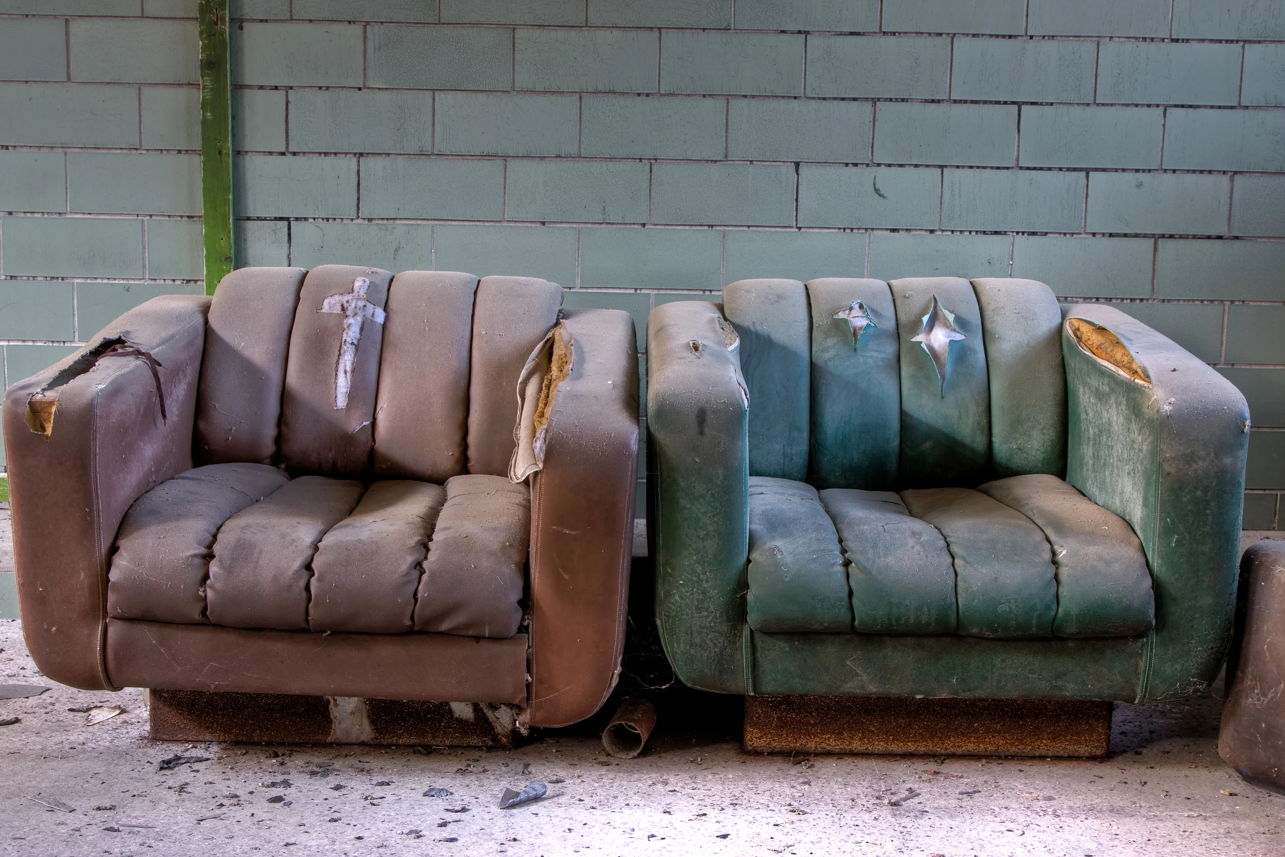 Selective urban decay photography — capturing evidence of human activity absent of actual human presence, evoking mystery and intrigue through abandoned or deteriorating scenes.